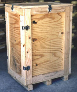 The container we designed has a removable end and cover, with a latch and lock system, for the ease of loading and unloading of its contents. The container was lined with various foam padding to support and hold the piece in place to reduce shock and distress during transport.